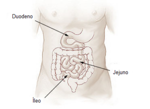 O intestino delgado é a parte do trato digestivo que vai do estômago (separado do piloro) até o intestino grosso (separado pela válvula ileocecal). O quimo é produzido a partir da primeira transformação do alimento no estômago, através do duodeno (a parte superior do duodeno) e no intestino delgado.